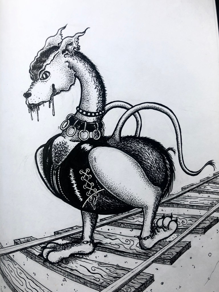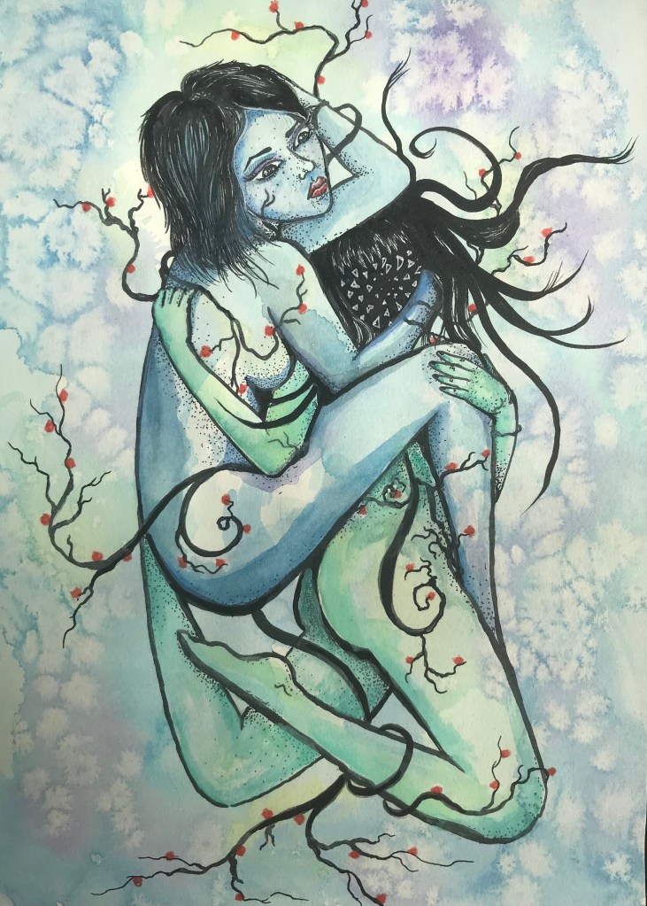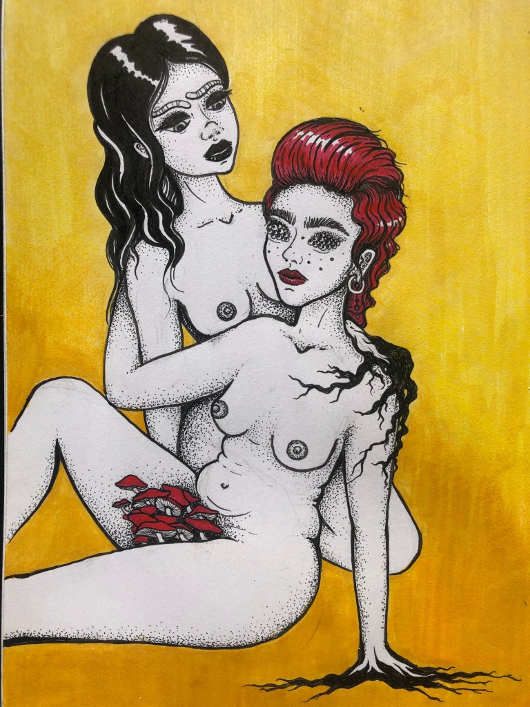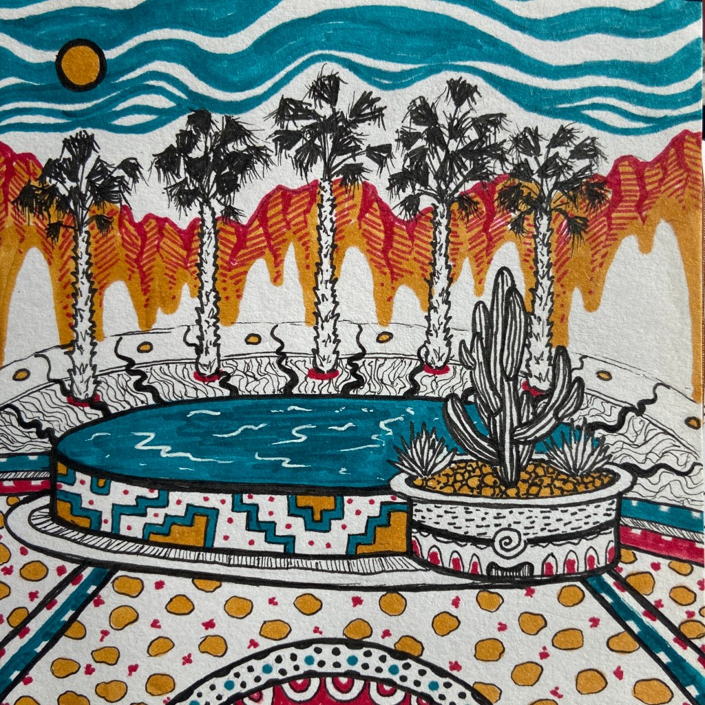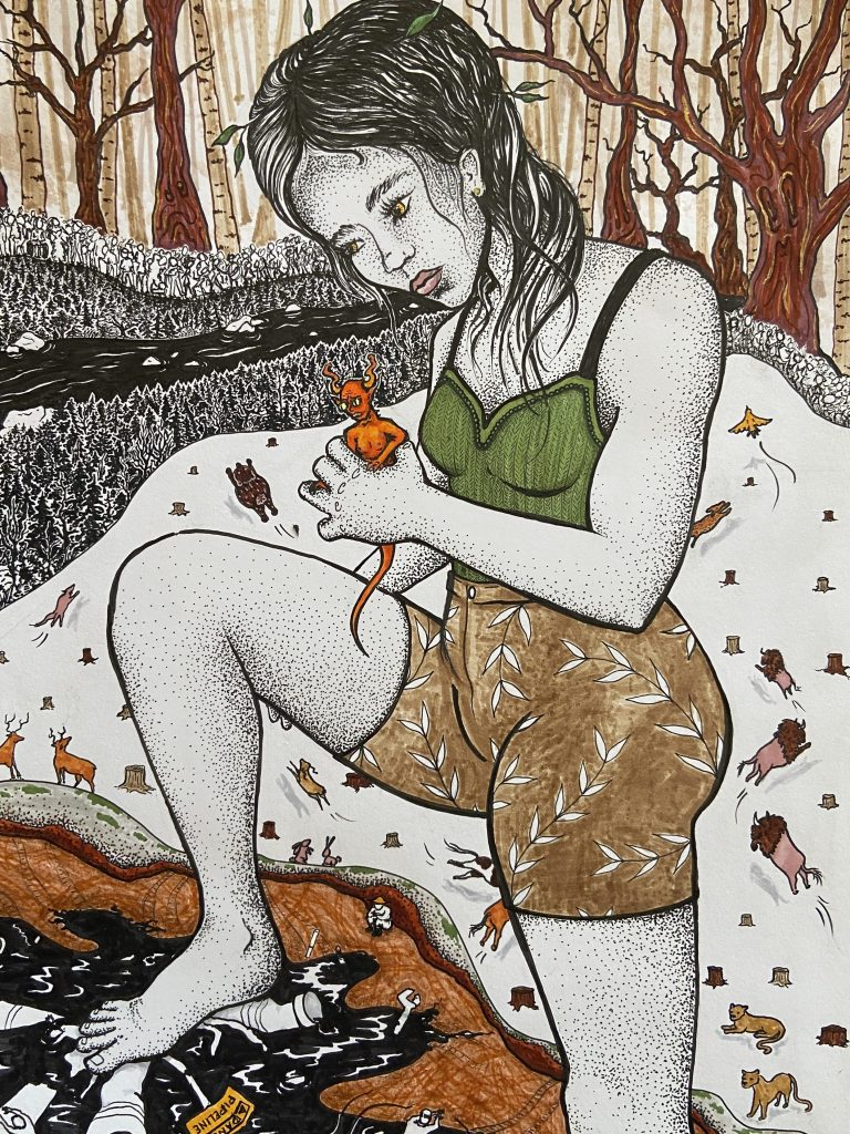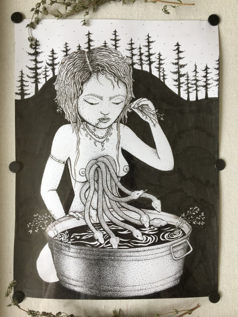 I use pens, markers, ink, watercolor, and colored pencils in my drawings.